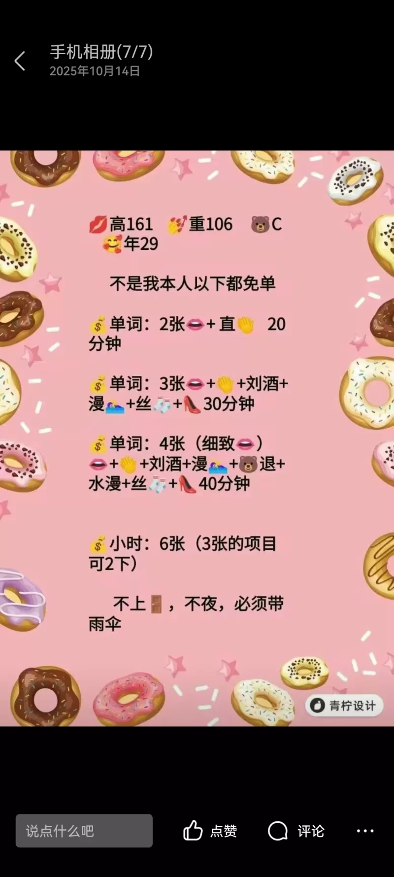 威客管理提示:要求付定金 保证金的,总之提前要钱的都是骗子 没事。忽然来了需求。就去群里翻找了一会。感觉这个还不错。就简单联系了一下问有时间。就开房间,给她以后等。过了大概半个小时。就到了。进来先陪你唠嗑,感觉很好。忍不住就开始上下其手。口活很不错。没有齿感。很尽力。忍不住了。就带上小雨衣开始。不细说都懂。之后交钱。休息下走人